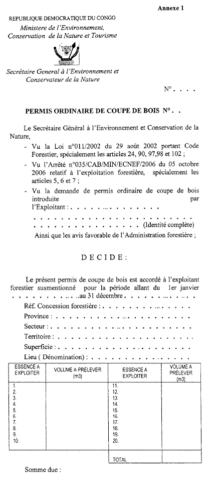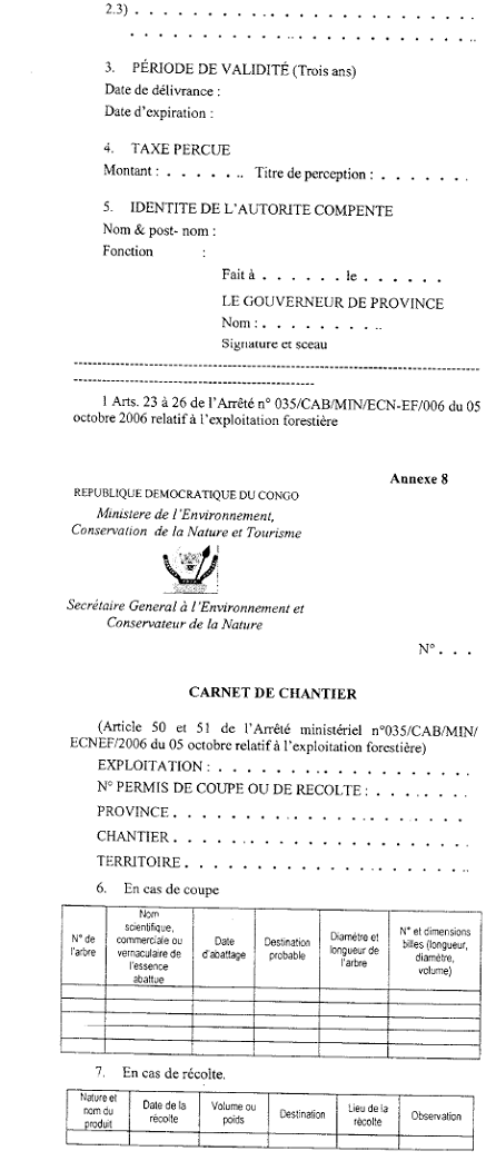 Le présent Arrêté a pour objet de compléter l'Arrêté n°035/CAB/MIN/ECN-EF/2006 du 05 octobre 2006 relatif à l'exploitation forestière, notamment en fixant le modèle des documents qui y sont prévus, en vue d'une exploitation conforme au Code forestier.