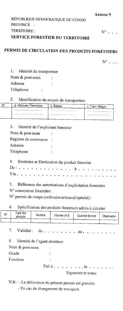 9.      Permis de circulation des produits forestiers ligneux et
